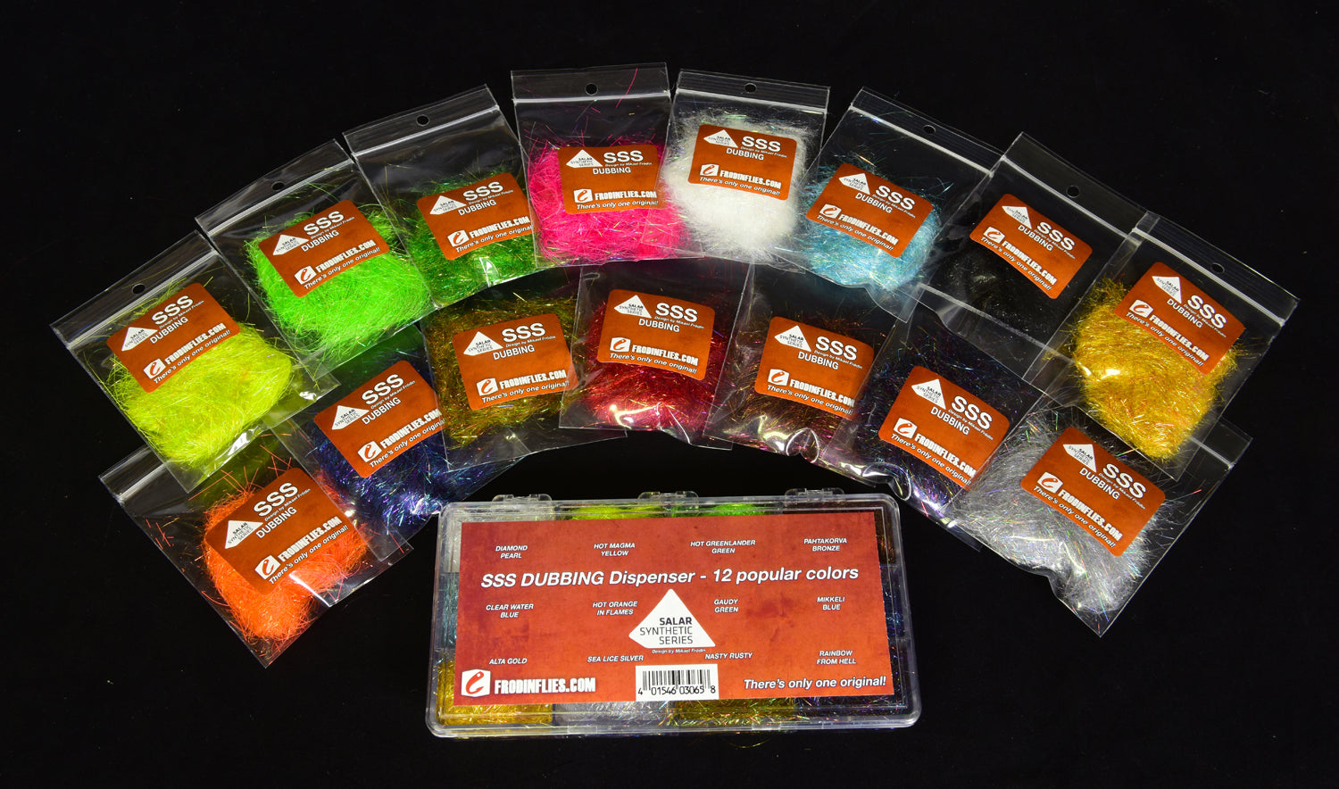 We never did understand why you should dub without brushing. The ultimate qualities of dubbing are to create a body that reflects and lets through as much light as possible. Most dubbings have too short strands to fit big flies. If you brush it half of the material will fall off which makes it impossible to get the right lustre. The structure of the SSS dubbing consists of transparent synthetic fibers, dyed and mixed with the SSS Angel Hair blends. The strands of the Angel Hair are cut long enough to enable the brushing without them falling off the body. The 15 color combinations give you many imaginable variations for everything you tie! SSS dubbing comes in 15 color blends.